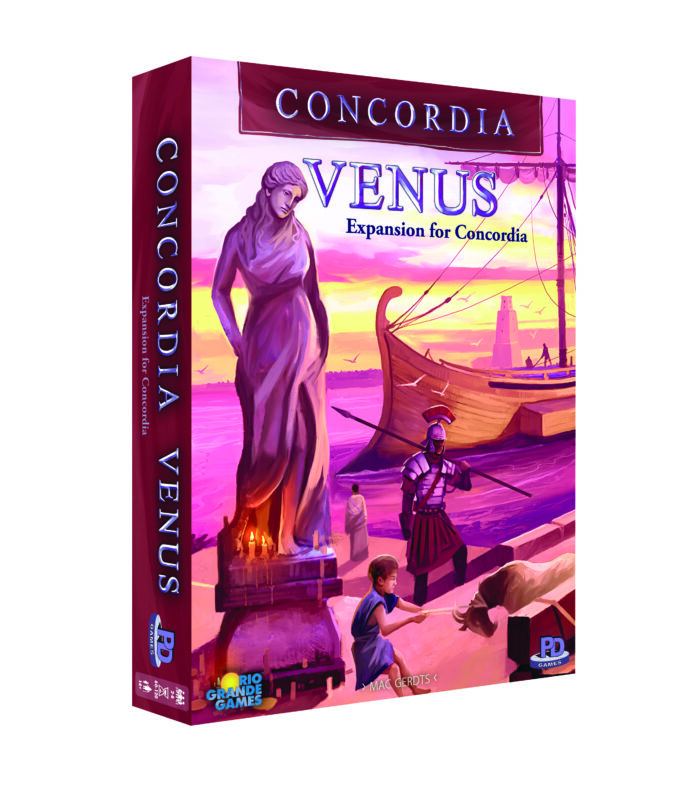 With the help of Venus, the goddess of love and intimacy, two partners work together at a game of Concordia while competing against one or two other teams. Mutual understanding and coordinated planning are essential to succeed as a harmonious couple. Venus also offers a challenging new game variant for 2 to 5 individual players. With additional game material for a sixth player and new game boards, Concordia Venus can be integrated with the base game and all previous Concordia expansions, including Salsa.
